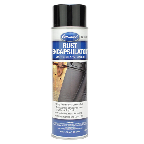 Eastwood Rust Encapsulator has been tested by an independent lab to be one of the most effective rust-preventive products yet. Rust Encapsulator is a great primer for floor pans and other underbody parts. It fills tiny pin-holes and surface irregularities, and is compatible with lacquer, enamel and urethane topcoats (including Eastwood Chassis Black). For the absolute ultimate rust remedy, first brush or spray-on Eastwood Rust Converter, then prime with Rust Encapsulator. One 425g aerosol covers about 10 sq. ft., and contains no isocyanates. Heat-resistant up to 204°C. Made in the USA.